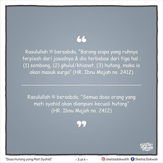 “Ya Allah, sesungguhnya aku berlindung kepada-Mu dari azab kubur, aku berlindung kepada-Mu dari fitnah Al Masih Ad Dajjal, aku berlindung kepada-Mu dari fitnah hidup dan fitnah mati. Ya Allah, aku berlindung kepada-Mu dari dosa dan hutang.” Kemudian ada seorang yang bertanya, “Alangkah seringnya engkau berlindung dari hutang.” Maka Beliau bersabda, “Sesungguhnya seseorang apabila berhutang, maka apabila berbicara berdusta, dan apabila berjanji mengingkari.” (HR. Bukhari)