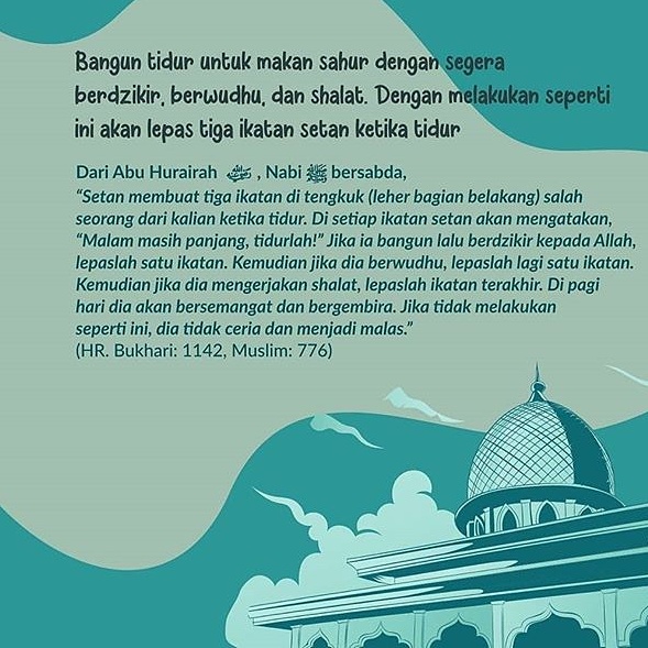 Bangun tidur untuk makan sahur dengan segera berdzikir, berwudhu, dan shalat. Dengan melakukan seperti ini akan lepas tiga ikatan setan ketika tidur.
